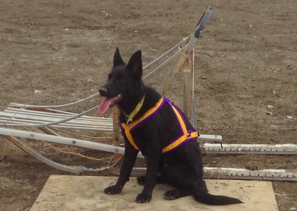 | black german shepherd dog harness harnessed sled dog snow |
